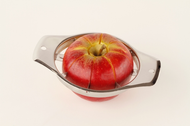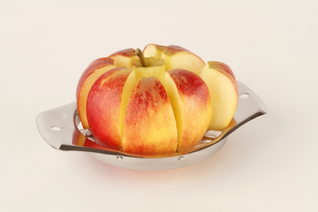 Alle Teile des Apfels in gleichmäßige und dekorative Stücke zu teilen gelingt spielend leicht und blitzschnell. Das Kerngehäuse wird gleichzeitig mit entfernt.